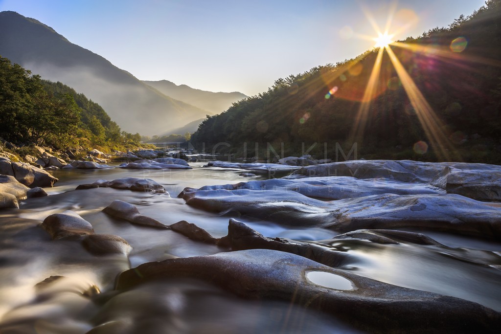 A radiant sunburst illuminates this mountain stream at dawn. The soft, flowing water contrasts with the smooth, sculpted rocks that define the riverbed. Mist lingers in the distance, partially obscuring the mountain peaks and adding a touch of mystery. Lush trees line the riverbanks, framing the scene with vibrant greenery. This photograph captures the serene beauty of nature waking up in a mountain landscape.