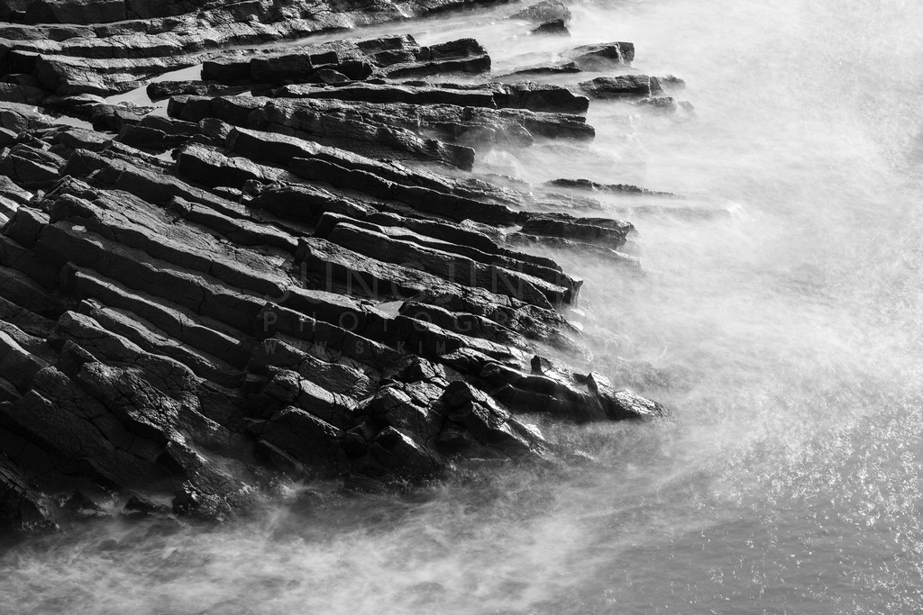 This black and white photograph showcases a unique geological rock formation, its sharp, layered structure creating a dramatic contrast against the smooth, misty water. The long exposure technique transforms the sea into an ethereal veil, softening the edges of the rocks and adding a sense of mystery. The interplay of light and shadow emphasizes the texture and depth of the rock, while the swirling mist creates a dynamic and captivating scene. This image evokes a sense of timelessness, highlighting the enduring power of nature.