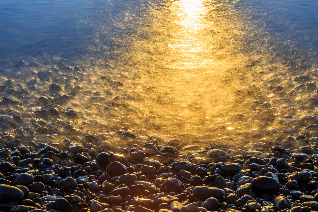 Smooth, dark stones meet gently rippling water illuminated by golden light. The low angle captures the textures of the wet rocks and the ethereal quality of the light reflecting on the water's surface. A sense of tranquility and warmth emanates from the image, inviting viewers to pause and appreciate the subtle beauty of the scene. The interplay of light and shadow creates a dynamic composition that draws the eye across the image.