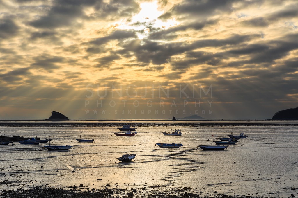 This striking image captures boats resting on a vast mudflat during a dramatic sunrise. The sun shines through a layer of textured clouds, casting rays of light across the scene. The low tide reveals the glistening mudflats, creating a unique landscape dotted with small fishing boats. Distant islands provide a sense of depth, enhancing the overall atmosphere of tranquility and solitude.