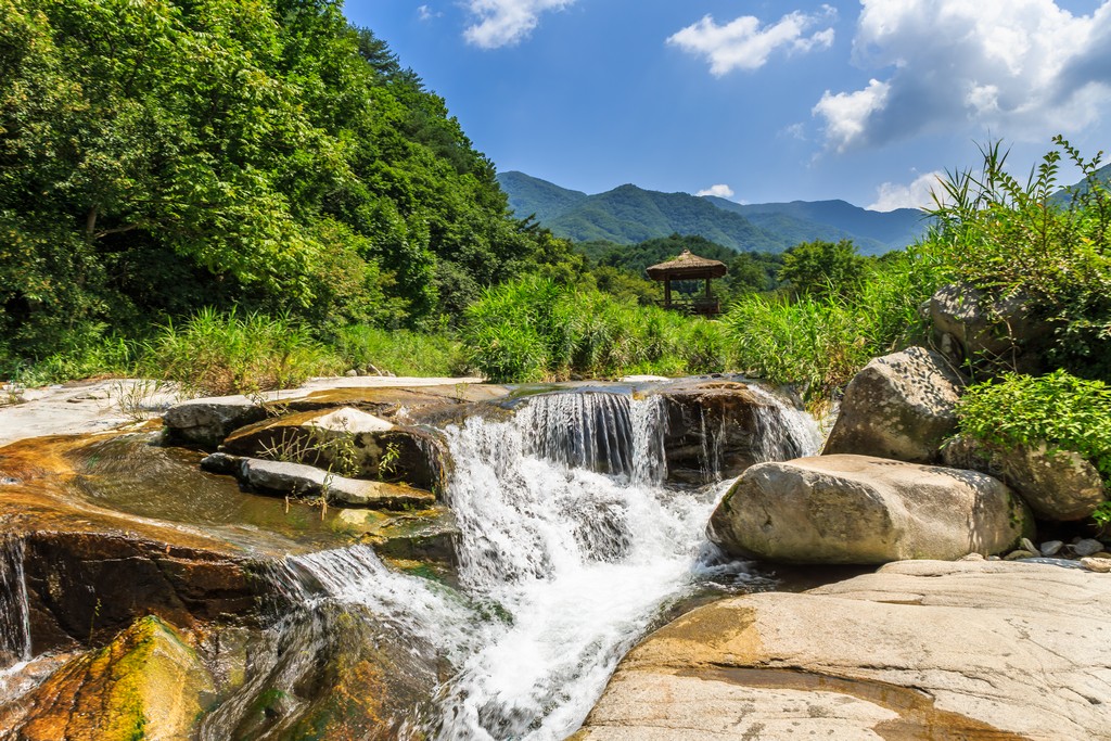 This image captures a picturesque scene of a clear mountain stream cascading over smooth, rocky ledges. Lush green vegetation thrives along the banks, creating a vibrant and tranquil setting. In the distance, a traditional gazebo adds a touch of human presence to the natural landscape. The blue sky with fluffy clouds enhances the overall feeling of peace and serenity.