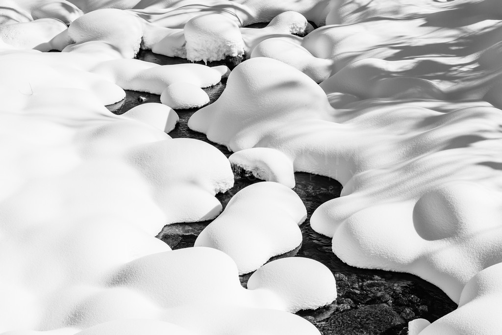 This monochrome photograph captures the stark beauty of a snow-covered stream. The high contrast between the bright white snow and the dark flowing water creates a visually striking image. The smooth curves of the snow-laden banks juxtapose with the dynamic movement of the water below. The subtle shadows cast by the surrounding trees add depth and intrigue. The image evokes a sense of tranquility and the quiet power of nature in winter.