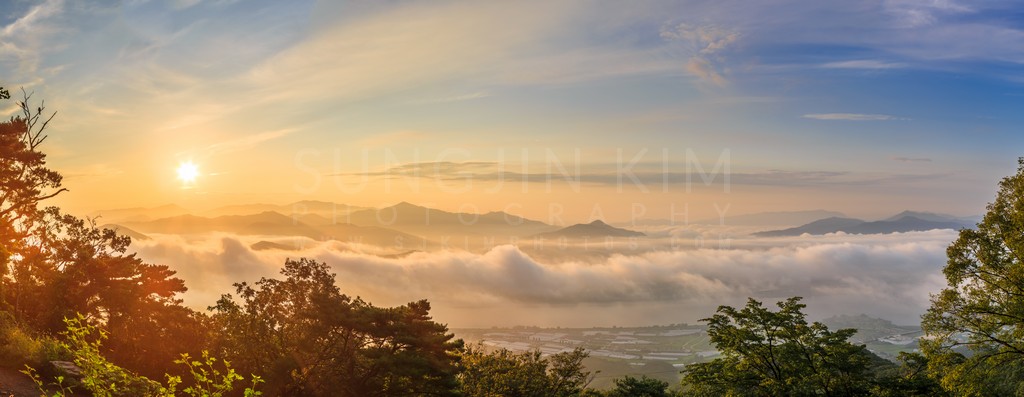 This panoramic image captures a breathtaking sunrise over a vast landscape, with mountains rising majestically above a sea of clouds. The golden sun casts a warm glow on the scene, illuminating the clouds and creating a sense of serenity. In the foreground, lush trees frame the view, adding depth and perspective. The image conveys the beauty and tranquility of nature's grand spectacle.