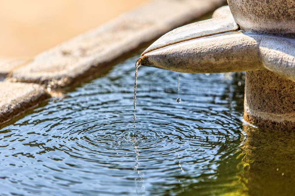 This close-up photograph captures the elegant dance of water as it flows from a stone fountain. The crisp focus on the droplets and streams contrasts beautifully with the soft ripples expanding across the surface. Natural light creates subtle reflections and highlights the textures of both the water and the stone. The image evokes a sense of tranquility and the timeless beauty of simple elements.