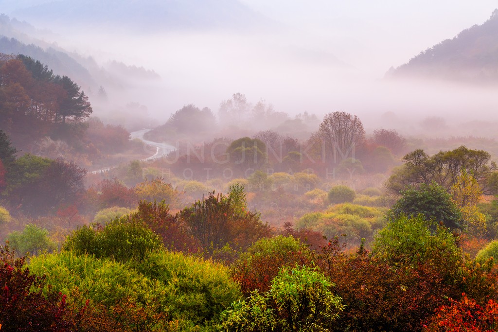 A serene landscape reveals a winding road disappearing into a valley blanketed in thick mist. The autumn foliage displays a rich tapestry of colors, adding warmth to the cool, ethereal atmosphere. The fog obscures the distant hills, enhancing the sense of mystery and tranquility. This image captures the beauty of nature's quiet moments.