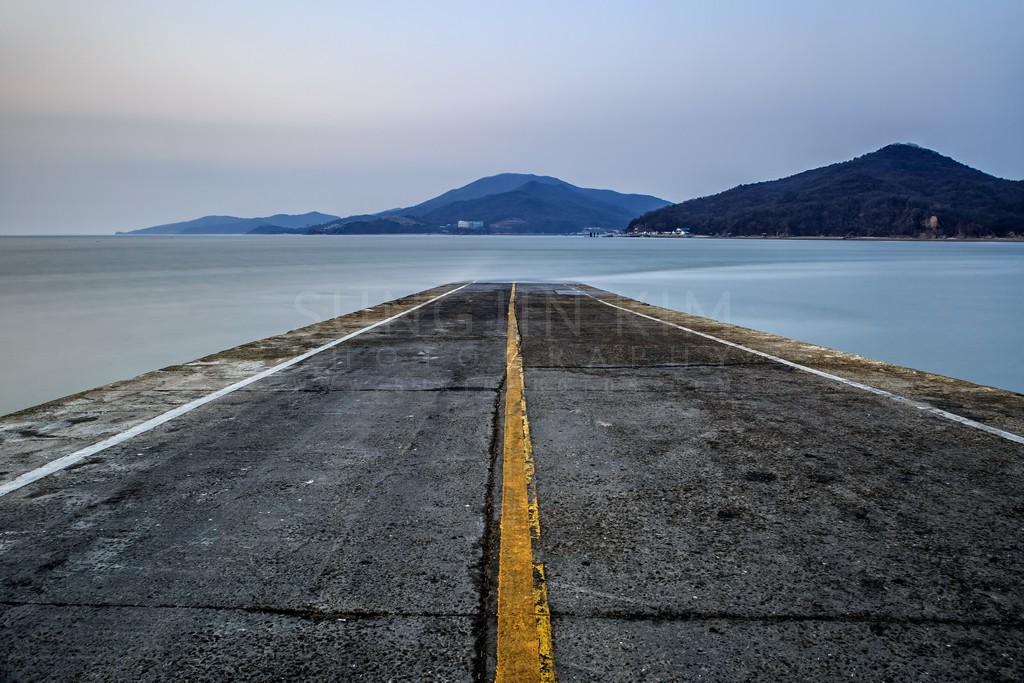 A concrete road stretches towards the horizon, seeming to melt into the smooth, ethereal waters. The long exposure creates a dreamlike effect, blurring the line between sea and sky. The muted color palette and minimalist composition evoke a sense of solitude and contemplation. The distant mountains offer a subtle backdrop to this mesmerizing seascape.