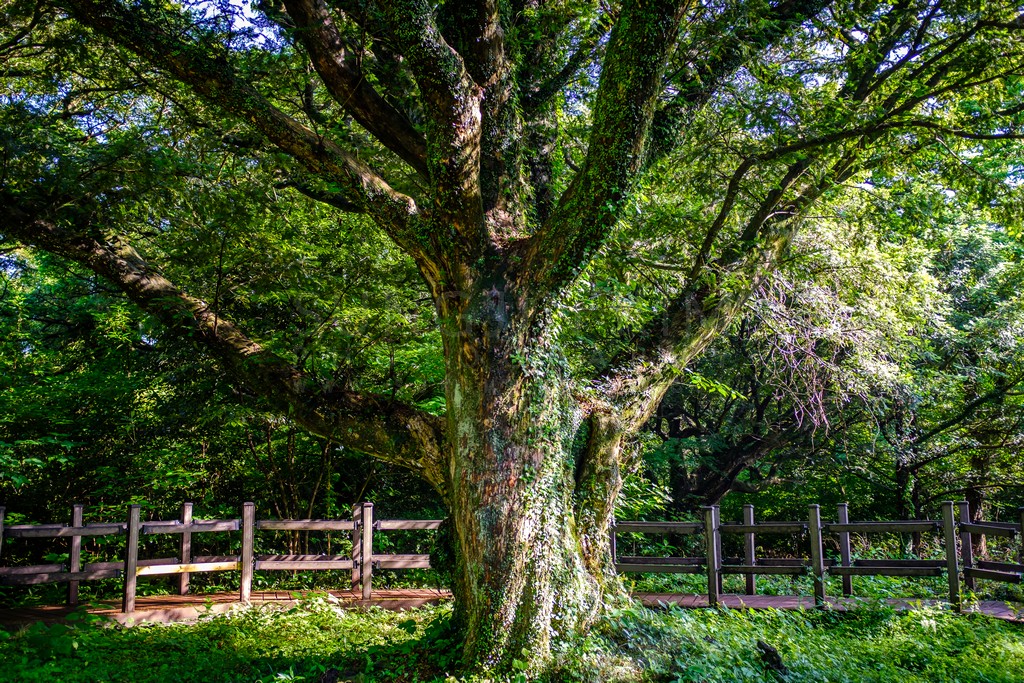A magnificent, sprawling tree stands as the focal point, its trunk covered in moss and lichen, showcasing its age and resilience. A weathered wooden fence encloses the tree and its surrounding area, hinting at a protected space. Sunlight filters through the dense canopy, illuminating the scene with a soft, natural glow. The image captures a sense of peace and reverence for nature's wonders.