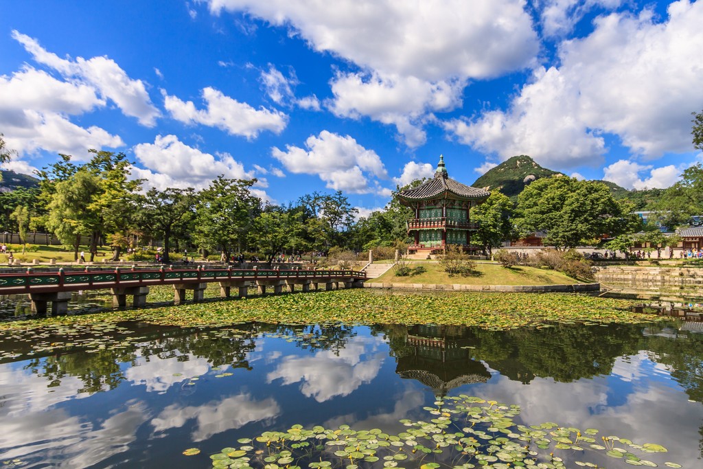 A traditional Korean palace structure graces the edge of a tranquil pond, its vibrant colors mirrored in the still water below.  Lush green foliage frames the scene, and a decorative bridge extends over the water lilies towards the palace, creating a sense of journey and invitation. The clear blue sky and puffy white clouds are also beautifully reflected, adding to the peaceful atmosphere. The image captures a moment of quiet beauty and cultural richness.