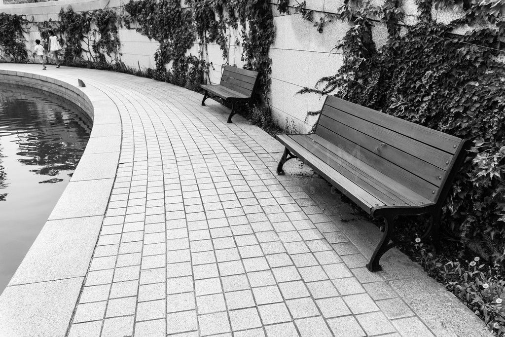 This monochrome image captures a peaceful scene of a paved pathway curving alongside a tranquil body of water. Two empty benches invite contemplation, nestled against a wall adorned with lush ivy. The contrasting textures of the smooth water, rough stone, and wooden benches create a visually engaging composition. The image evokes a sense of serenity and quietude, perfect for reflecting on life's simple moments. The perspective leads the eye along the path, creating a sense of depth and inviting exploration.