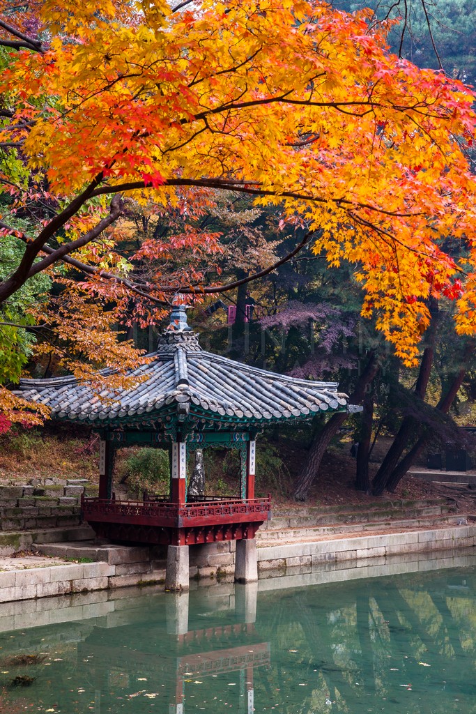 Vibrant autumn foliage frames a traditional pavilion perched over a tranquil pond. The rich reds and oranges of the leaves contrast beautifully with the muted blues and greens of the pavilion and water, creating a harmonious scene. Soft light illuminates the scene, enhancing the textures and details of the structure and its surroundings. The calm reflection of the pavilion in the still water adds a sense of peace and serenity to the image.