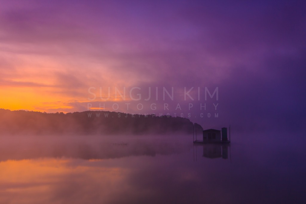 A lone floating cabin rests on a still lake enveloped in a veil of mist as the sun rises, painting the sky with vibrant hues of orange and purple. The soft, diffused light creates a tranquil and ethereal mood, emphasizing the stillness of the water and the solitude of the scene. Silhouetted trees on the distant shore add depth to the composition, while the reflection of the colorful sky on the water enhances the overall serenity. The image evokes a sense of peace and quiet contemplation, capturing the beauty of nature at its most serene.