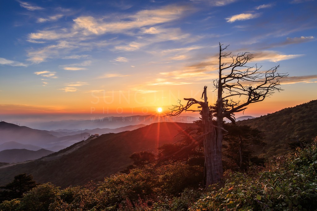 A weathered, skeletal tree stands sentinel as the sun crests over rolling mountain ridges, bathing the landscape in warm hues of orange and gold. Misty valleys stretch out below, adding a sense of depth and mystery. The stark contrast of the dark tree against the vibrant sky creates a powerful visual statement, capturing the raw beauty of nature's resilience. The composition expertly uses the tree to frame the rising sun, drawing the viewer's eye into the scene. This image evokes a feeling of peaceful solitude and the timeless grandeur of the mountains.