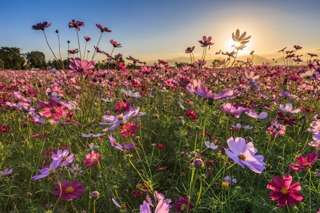 A vibrant field of cosmos flowers bursts with color as the sun peeks over the horizon, casting a warm glow across the landscape. The delicate pink and purple petals are backlit, creating a stunning display of light and shadow. The low angle emphasizes the density of the blossoms and their reach towards the light. The image evokes a sense of joy and wonder, capturing the beauty of nature's ephemeral moments.