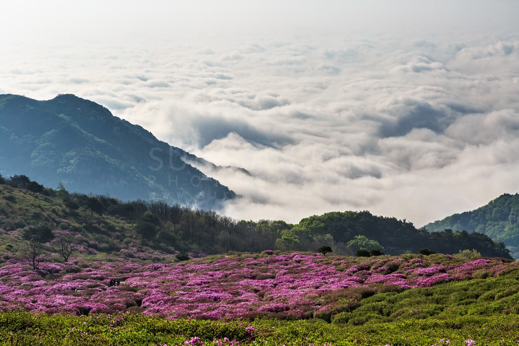 A vibrant carpet of pink azaleas blankets the hillside, creating a striking contrast against the deep green foliage. A vast sea of clouds stretches out below, partially obscuring the distant mountains and creating a sense of ethereal beauty. Soft, diffused light enhances the colors and adds to the tranquil atmosphere of the scene. The composition emphasizes the vastness of the landscape and the delicate beauty of the flowers.
