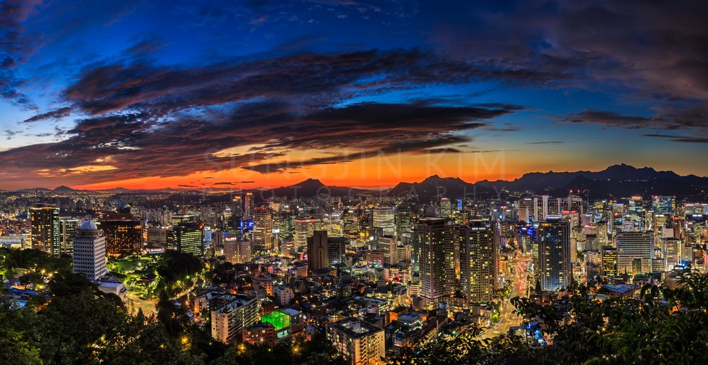 This panoramic cityscape of Seoul, South Korea, captures the vibrant energy of the city as it transitions from day to night. The dramatic sunset casts a fiery glow across the sky, contrasting with the cool blues and deep shadows. The densely packed buildings, illuminated from within, create a mesmerizing pattern of light and shadow. The distant mountains provide a serene backdrop to the bustling urban scene, adding depth and perspective to the composition.