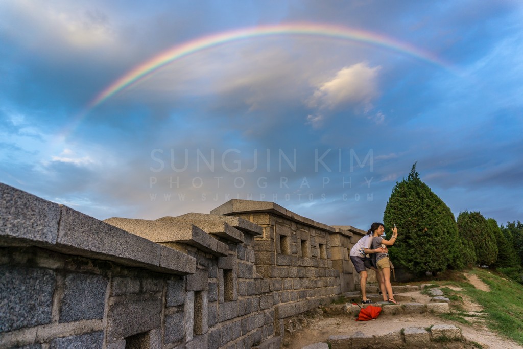 A vibrant rainbow arches across the sky, framing a couple capturing a selfie against a backdrop of ancient stone walls. The soft, diffused light of the fading day casts a gentle glow on the scene, creating a sense of wonder and romance. The composition juxtaposes the timeless strength of the wall with the fleeting beauty of the rainbow and the contemporary act of capturing the moment. The couple's embrace adds a layer of human connection to this unique natural spectacle.