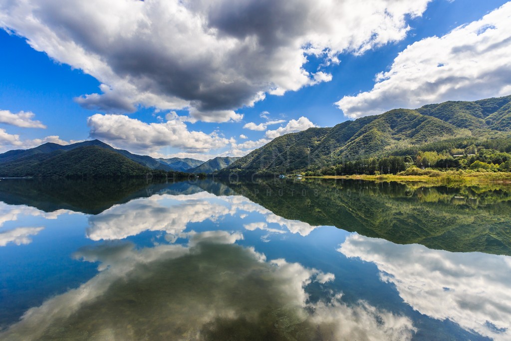 Mirrored Mountains and Clouds on Calm Lake