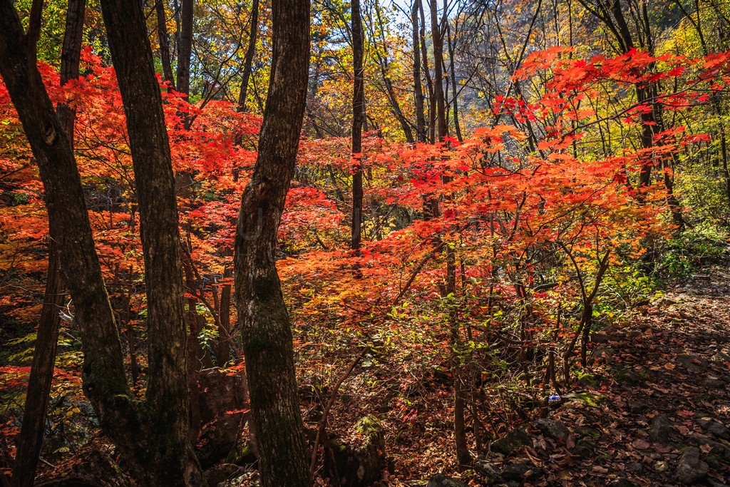 Vibrant red and orange maple leaves illuminate a tranquil forest scene. The interplay of light and shadow creates depth, highlighting the rich textures of bark and foliage. A hushed, contemplative mood pervades the image, capturing the essence of autumn's beauty. The composition draws the viewer's eye through the vibrant tapestry of color and into the heart of the woods.