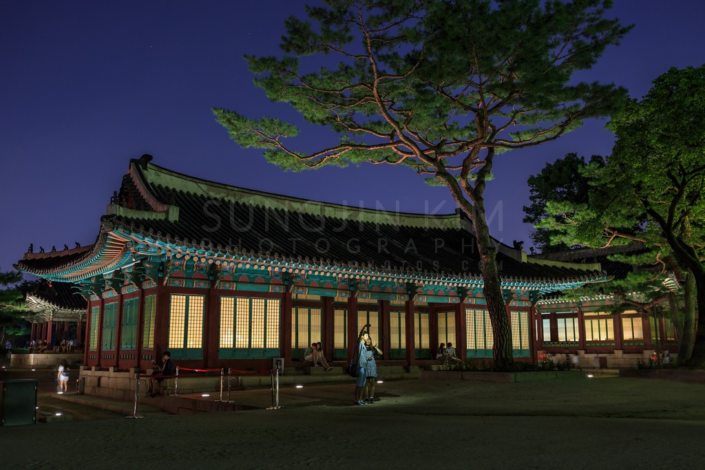This photograph captures the serene beauty of a traditional East Asian palace at twilight. The warm interior lights contrast with the deepening blue of the evening sky, creating a peaceful and inviting atmosphere. A gracefully lit pine tree frames the scene, adding a touch of natural elegance. The intricate details of the palace architecture are highlighted by the carefully balanced lighting. The presence of a few visitors adds a sense of scale and quiet contemplation to the scene.
