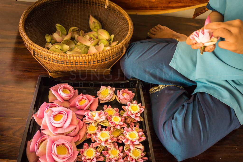 Soft, pink lotus blossoms are meticulously arranged on a dark tray, their delicate petals unfolding. A person, dressed in teal, carefully crafts another blossom from a basket of petals, their hands a blur of gentle motion. The warm, ambient light highlights the vibrant colors of the flowers and the rich textures of the woven basket and wooden floor. This intimate scene evokes a sense of reverence and tradition.