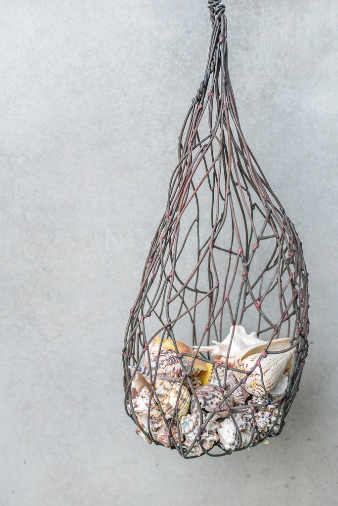 A collection of seashells rests within a delicate, handcrafted wire basket, suspended against a muted gray backdrop. The intricate wirework of the basket contrasts beautifully with the varied textures and colors of the shells, creating a visually appealing composition.  Soft, diffused lighting enhances the natural beauty of the shells and the delicate craftsmanship of the basket. The image evokes a sense of quiet stillness and appreciation for the simple beauty of nature's treasures.