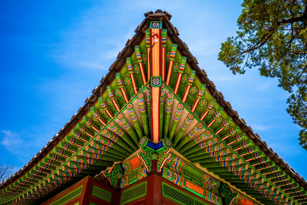 This image showcases the intricate details and vibrant colors of traditional Korean architecture. The ornate eaves of the roof, painted in shades of green, red, and orange, create a striking contrast against the clear blue