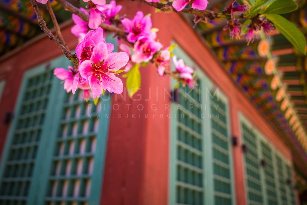 Vibrant pink blossoms take center stage, their delicate petals contrasting against the soft-focus backdrop of a traditional building. The red and teal architectural elements create a pleasing color harmony, while the shallow depth of field emphasizes the blossoms' beauty. The composition utilizes the blossoms as a natural frame, drawing the viewer's eye towards the colorful details of the building. This image captures the ephemeral beauty of spring and the timeless charm of traditional architecture.