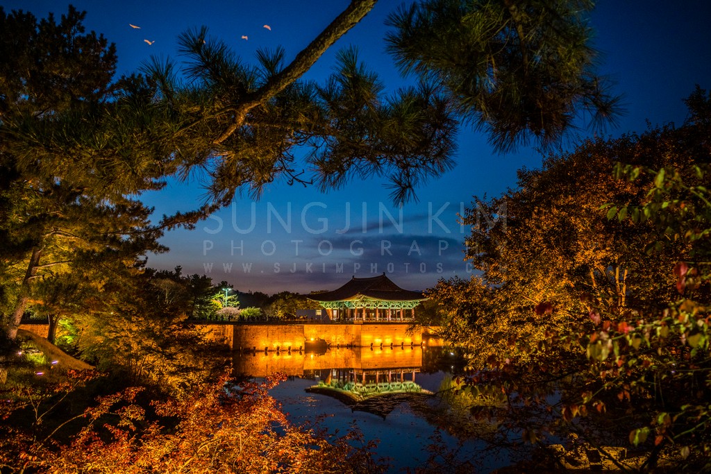 A traditional Korean palace structure is beautifully illuminated at twilight, reflected serenely in the still pond below. Warm, artificial lights highlight the architecture and surrounding foliage, creating a vibrant contrast against the deepening blue sky. Framed by the dark silhouettes of pine branches, the scene evokes a sense of peaceful tranquility and cultural richness. The composition emphasizes the symmetry and balance of the palace and its reflection.