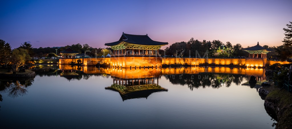 This panoramic photograph captures the serene beauty of a traditional Korean palace at twilight. The warm glow of the palace lights illuminates the intricate architecture and its reflection in the still pond. The transition from the deep blue of the evening sky to the warm hues of the palace creates a captivating contrast. The tranquil waters mirror the scene, doubling the visual impact and adding a sense of peace. The composition emphasizes the symmetry and balance of the palace and its surroundings.