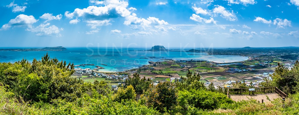 This panoramic vista captures the serene beauty of a Korean coastal landscape. The vibrant turquoise waters contrast with the patchwork of agricultural fields and the distant volcanic peak. Lush greenery frames the scene, adding depth and a touch of wildness to the cultivated land. The bright midday sun illuminates the scene, creating a cheerful and inviting atmosphere. The composition emphasizes the vastness of the ocean and the harmonious coexistence of nature and human development.