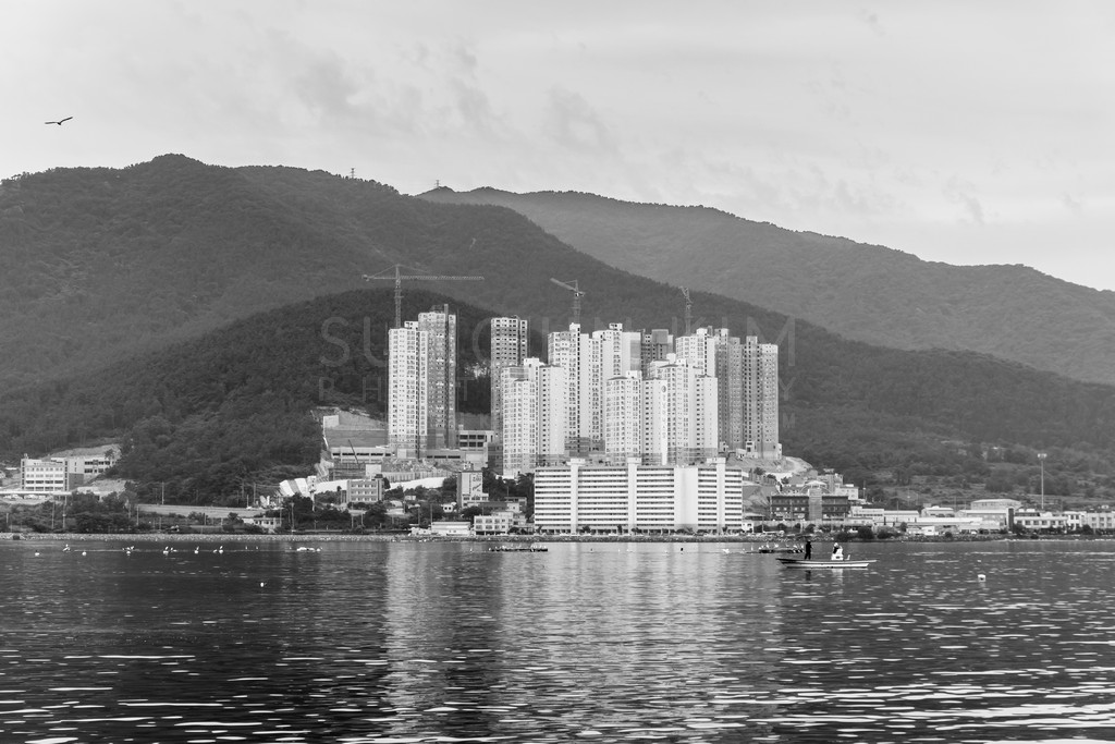 Coastal Cityscape in Monochromatic Harmony