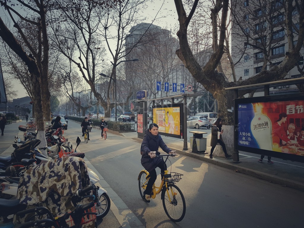 A woman cycles down a city street, bathed in the soft, diffused light of a winter afternoon. Bare branches of trees line the sidewalk, creating a stark yet beautiful backdrop. The scene is a quiet observation of daily life in an urban setting, capturing the subtle interplay of light and shadow. The composition draws the viewer's eye along the path, offering a glimpse into the rhythm of the city.