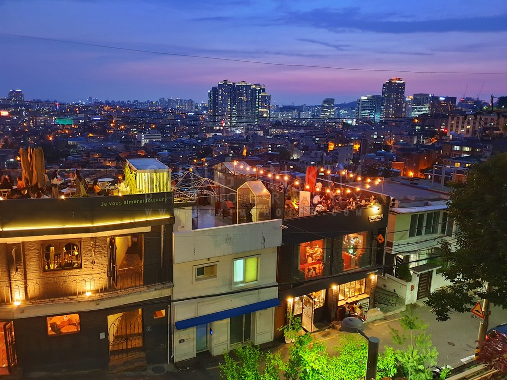 This captivating cityscape captures the vibrant energy of a city at twilight. The warm glow of rooftop restaurants and bars contrasts with the cool hues of the fading sky, creating a dynamic and inviting scene. The composition emphasizes the bustling atmosphere of the rooftop gatherings, while also showcasing the layered urban landscape stretching into the distance. The image beautifully blends the intimacy of social life with the grand scale of the urban environment.