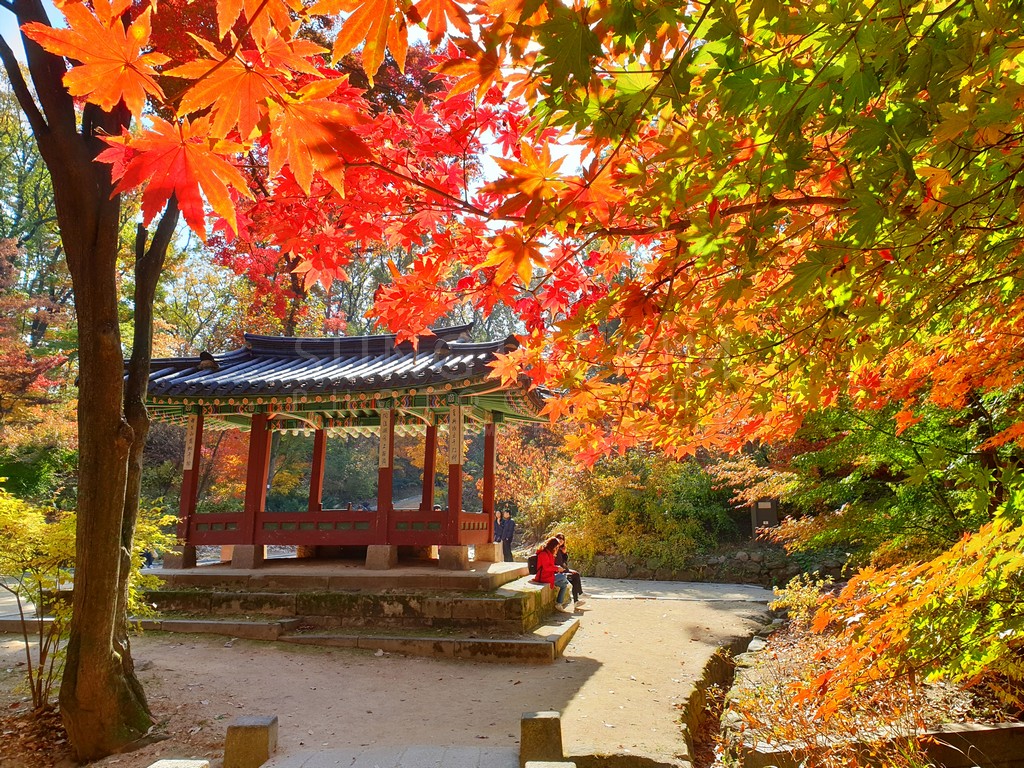 Vivid hues of red and orange maple leaves frame a traditional Korean pavilion, creating a scene of serene beauty. Sunlight filters through the canopy, casting dappled light on the ground where two individuals sit peacefully. The rich textures of the foliage and the intricate details of the pavilion's architecture are highlighted by the soft, natural light. This image captures the essence of autumn's gentle embrace in a tranquil garden setting.