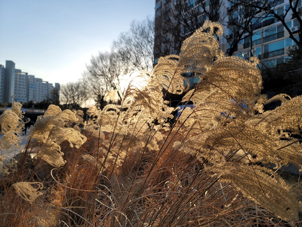The setting sun casts a warm glow on a stand of ornamental grasses, their feathery plumes catching the light and creating a delicate interplay of light and shadow. The blurred cityscape in the background provides a subtle contrast to the natural beauty of the grasses, highlighting the unexpected pockets of nature found within urban environments. The soft, diffused light adds a touch of serenity to the scene, capturing a moment of quiet beauty in the bustling city. This image evokes a sense of peace and tranquility, reminding us of the simple elegance of nature.