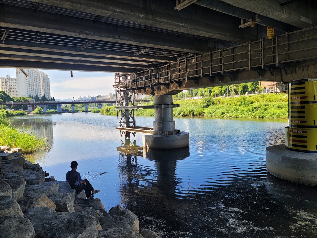A lone figure sits contemplatively on the rocks at the edge of the river, dwarfed by the imposing concrete structure of the bridge above. The calm water reflects the bridge's supports and the surrounding cityscape, creating an interesting interplay of light and shadow. The scene evokes a sense of urban solitude amidst the bustling city life, capturing a quiet moment of reflection. The composition uses leading lines and contrasting textures to draw the viewer's eye through the image.