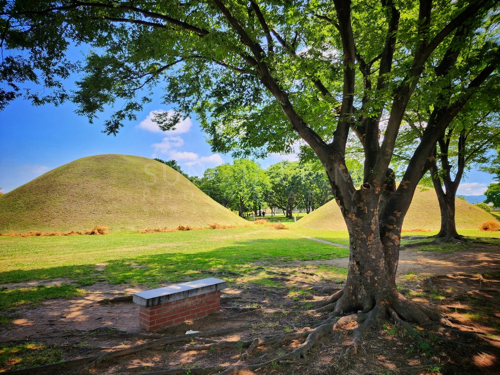 Two large, grassy mounds rise gently against a backdrop of lush green trees and a vibrant blue sky dotted with soft white clouds. The warm sunlight filters through the leaves, dappling the ground and highlighting the intricate network of tree roots around a simple brick bench. This serene composition evokes a sense of tranquility and historical significance, blending nature and human presence. The image invites viewers to step into a moment of quiet contemplation, surrounded by the echoes of the past.