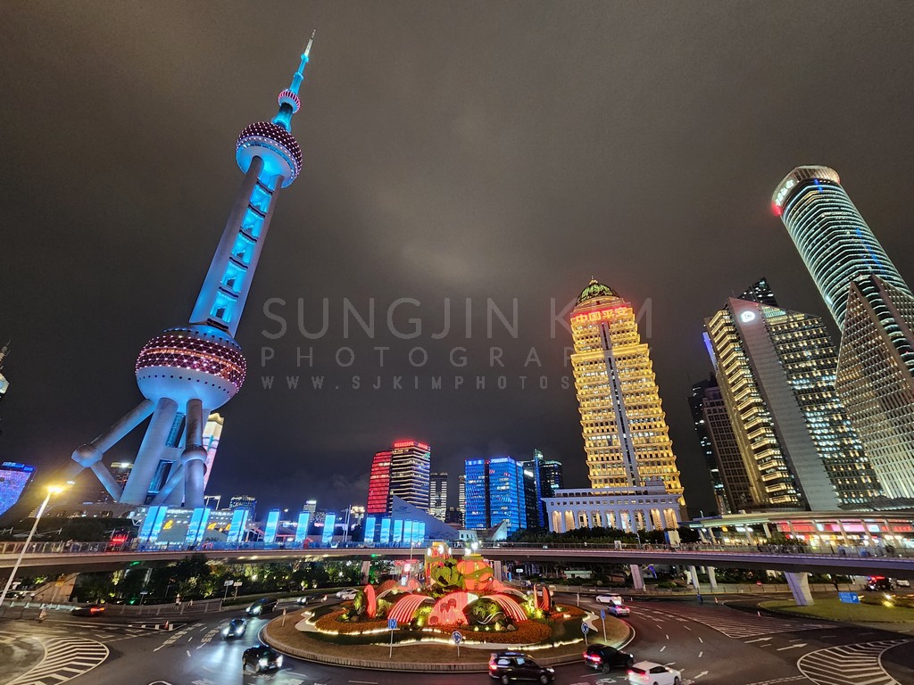 Vibrant neon lights illuminate Shanghai's iconic skyline, casting a futuristic glow on the Oriental Pearl Tower and surrounding skyscrapers. The dynamic composition captures the city's energetic pulse, with traffic flowing around a brightly lit roundabout. The dark sky provides a dramatic backdrop, enhancing the colorful spectacle below. This photograph encapsulates the modern marvel of Shanghai's urban landscape at night.
