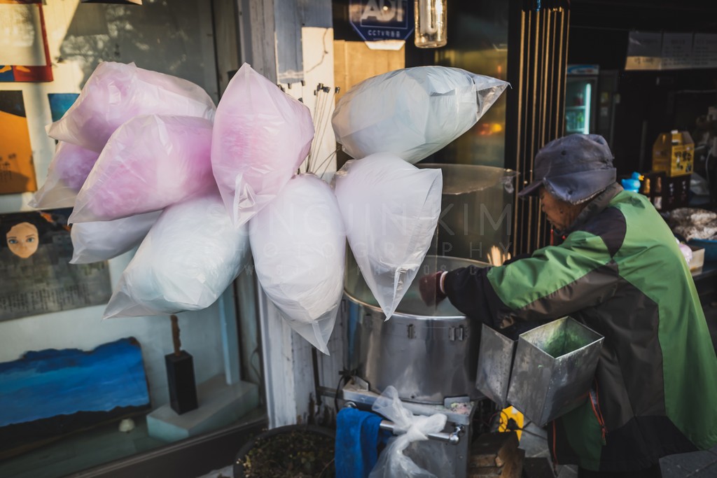 This photograph captures a street vendor expertly crafting cotton candy, the fluffy pink and white clouds bagged and waiting for eager hands. The focus on the process, with the vendor partially obscured, highlights the almost magical creation of this sweet treat. The contrasting colors and textures of the cotton candy, plastic bags, and vendor's clothing create a visually engaging scene, evocative of childhood memories and simple pleasures. The diffused lighting lends a gentle touch to the image, enhancing the dreamlike quality.