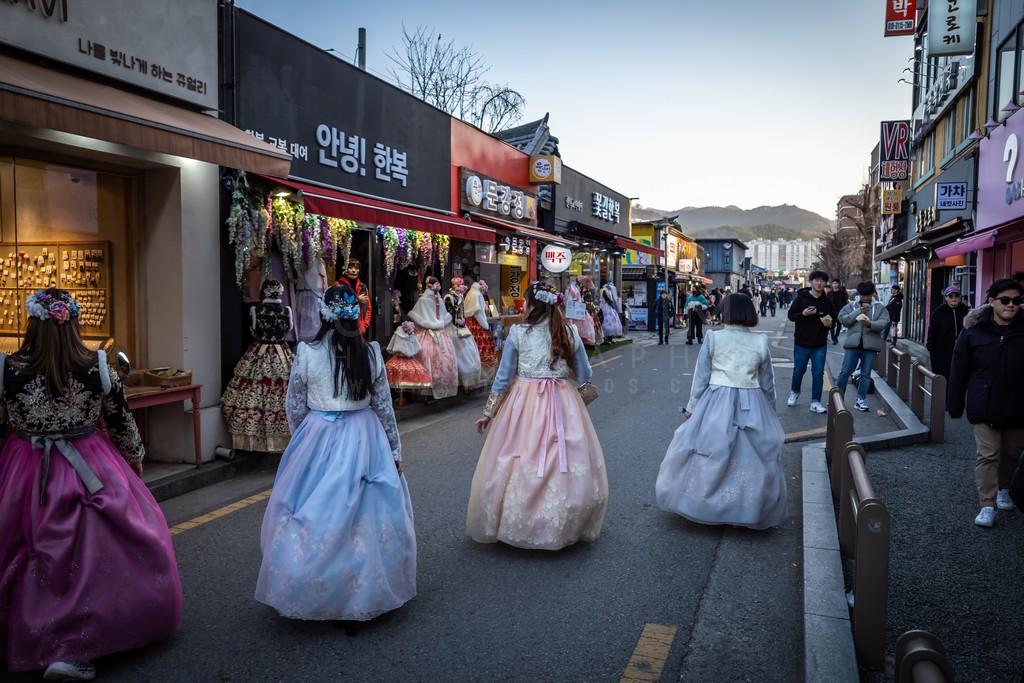 Four women in vibrant hanbok, traditional Korean dresses, grace a bustling city street. The flowing lines and rich colors of their attire stand out against the backdrop of shops and signage. The natural light of late afternoon illuminates the scene, capturing a moment of cultural expression amidst modern life. The image highlights the enduring beauty of tradition in a contemporary urban setting.