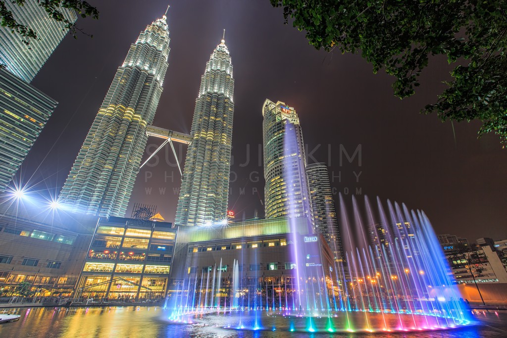 The majestic Petronas Twin Towers dominate the night sky, their intricate architecture glowing against the darkness. A vibrant fountain display illuminates the foreground, its colorful jets of water creating a dynamic contrast to the static grandeur of the towers. The wide angle captures the immensity of the scene, showcasing the surrounding buildings and the bustling energy of the city below. The reflection of the light on the water adds depth and a sense of wonder to the composition.