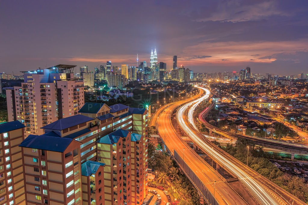 This vibrant cityscape captures the energy of a metropolis at dusk. The warm hues of the fading daylight blend seamlessly with the electric glow of city lights, creating a dynamic interplay of light and shadow. Streaks of light trace the paths of vehicles along the highway, illustrating the constant movement of urban life. Residential buildings in the foreground offer a contrast to the towering skyscrapers in the distance, providing a sense of scale and perspective. The composition balances the built environment with the natural landscape, showcasing the complex relationship between city and nature.