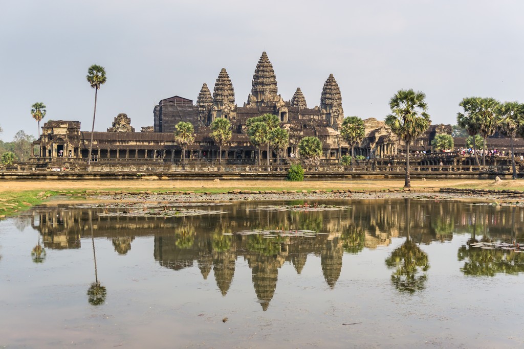 This photograph captures the iconic Angkor Wat temple complex reflected serenely in the surrounding water. The soft, diffused light emphasizes the intricate details of the ancient Khmer architecture while palm trees frame the scene, adding a touch of tropical charm. The stillness of the water creates a perfect mirror image, doubling the visual impact and enhancing the sense of tranquility. The composition highlights both the grandeur of the temple and the peaceful beauty of its surroundings.