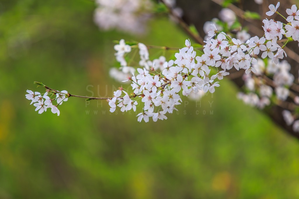 This photograph captures the delicate beauty of cherry blossoms in full bloom against a soft, green backdrop. The shallow depth of field isolates the blossoms, highlighting their intricate details and creating a dreamy atmosphere. The subtle light enhances the pure white of the petals and emphasizes their gentle texture. The composition draws the viewer's eye along the delicate branch, showcasing the ephemeral beauty of spring.