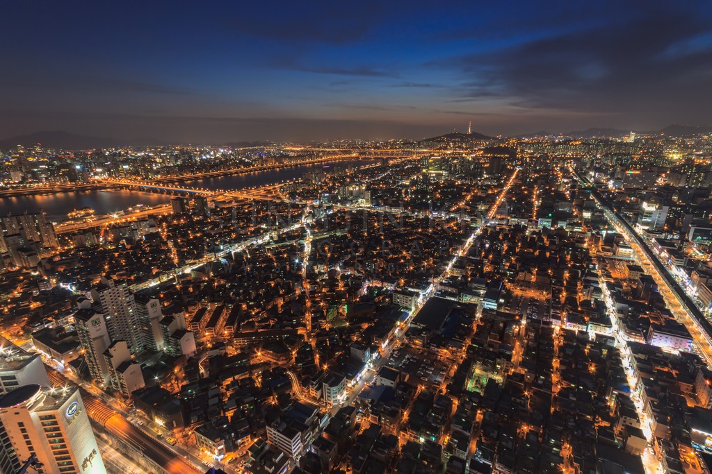 This captivating aerial photograph captures the sprawling cityscape of Seoul at twilight. The warm glow of streetlights illuminates the dense network of buildings and roads, creating a mesmerizing tapestry of urban life. The distant skyline and illuminated bridges add depth to the scene, while the last vestiges of daylight in the sky enhance the overall mood. The high vantage point offers a unique perspective on the city's complex and vibrant character.