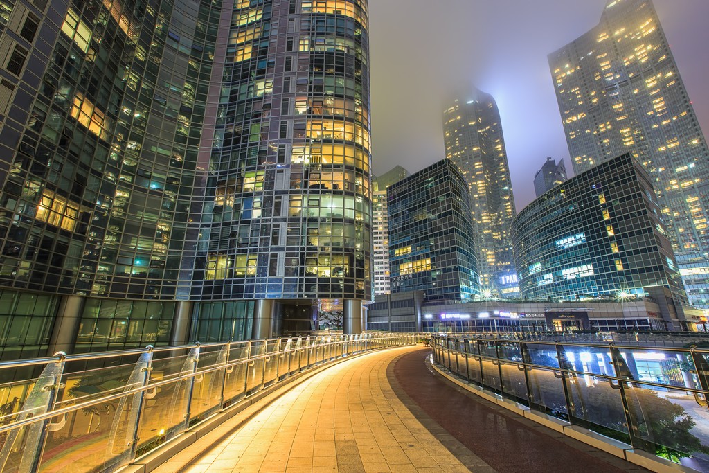 This captivating photograph captures a modern cityscape at night, shrouded in a soft mist that adds a touch of mystery and intrigue. The curved walkway, bathed in warm light, guides the viewer's eye through the scene, while the towering skyscrapers loom in the background. The interplay of light and shadow, combined with the ethereal mist, creates a moody and atmospheric image, conveying a sense of both peace and dynamism. The glass railings of the walkway add a touch of elegance and modernity to the scene.