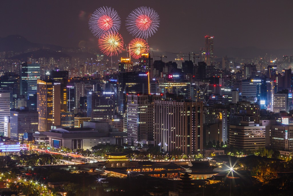 This captivating nightscape showcases the dazzling Seoul skyline punctuated by a vibrant fireworks display. The city lights twinkle below, creating a mesmerizing tapestry of urban energy. The composition captures the dynamic interplay of light and shadow, highlighting the architectural diversity of the cityscape. The festive bursts of color add a touch of magic and celebration to the scene.