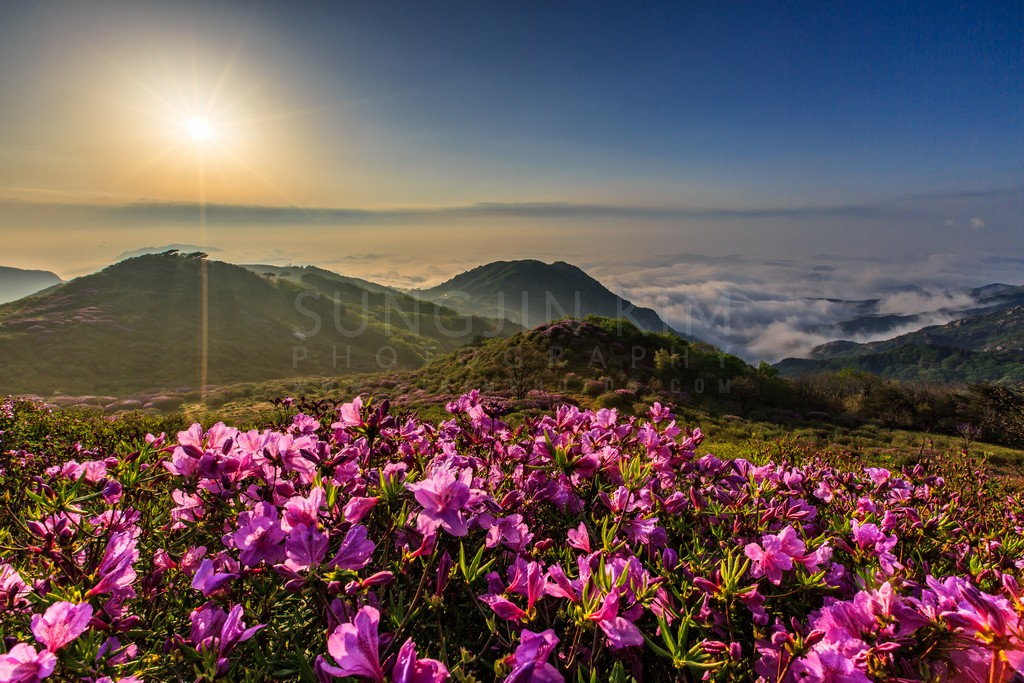 A picturesque scene of rolling mountains rising above a sea of clouds, framed by a foreground of brilliant pink blossoms. The rising sun casts a warm glow over this idyllic landscape.