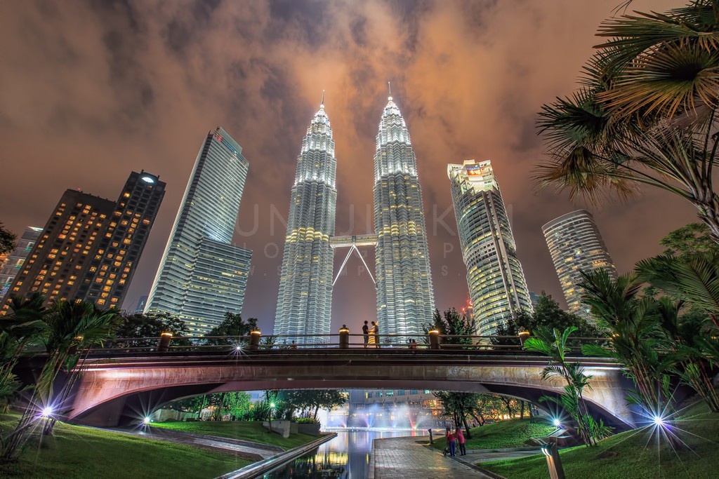 The iconic Petronas Towers dominate the cityscape, their illuminated structures piercing the moody, cloud-filled night sky. Viewed from beneath a pedestrian bridge, the towers' grandeur is emphasized by the low angle and wide perspective. Warm lights from surrounding buildings and parkland create a contrasting glow against the cool tones of the evening. A couple stands silhouetted on the bridge, adding a touch of human scale to this urban vista.