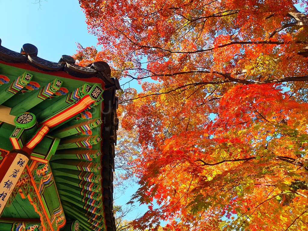 This image captures the vibrant colors of autumn foliage against the intricate details of a traditional Korean eaves. The rich reds and oranges of the maple leaves create a striking contrast with the green, red, and black of the painted woodwork. The low-angle shot emphasizes the height and spread of the tree, while the clear blue sky provides a serene backdrop. The image evokes a sense of tranquility and appreciation for the beauty of nature and cultural artistry.